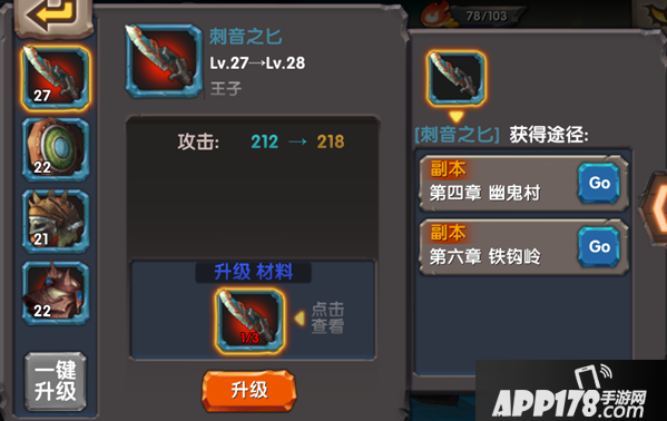 如果想要一个角色的强悍,那么我们就需要在角色升级之后,强化每个角色的装备。我们随机选取一件装备,游戏会自动跳转到装备升级界面。在屏幕的左下方,会有一个一键升级的按钮,屏幕下方会显示所需的升级材料,如果材料充足,我们可以直接点击一键升级,对装备进行强化。如果材料不够的情况下,不用担心,这款游戏有一个非常强大的引导功能,点击所需的材料,游戏会自动提示该材料的获取副本,直接进入副本去刷材料就好了。游戏中获得材料的几率非常高,所以大家不需要担心升级装备很吃力,把所有体力刷完都打不到升级这个材料的苦恼。升级材料充足后,我们就来强化装备吧!