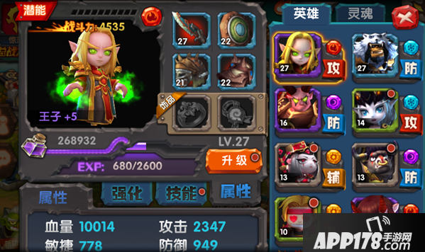 首先,我们点开英雄的界面,会发现每个英雄都有四个固定的装备,分别为:剑、盾、头盔、护肩。