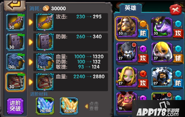装备每10级为一个阶段,全部装备每升满10级后,装备系统会提示大家该装备需要进阶才可以提高装备等级上限。进入装备进阶界面,使用进阶材料对装备进行进阶。我们在平时的战斗中,都可以收集到装备升级以及进阶的相关材料,如果材料发生短缺,不要担心,带上你的宝宝以及你的小伙伴们,一起去攻打武器库获取材料吧!