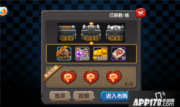 入场后有3次挑战机会,挑战失败扣除1次挑战机会,失败3次结束挑战。最多可累计6次胜利奖励。VIP5以上等级可获得额外挑战机会,具体参考VIP系统。