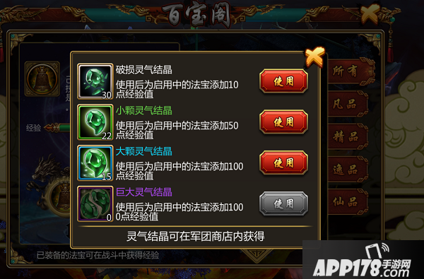 当然游戏中的黑市和军团的商店里,也会随机刷新一些提供经验值的结晶,购买他们后可以更快速度的让你的法宝成长。