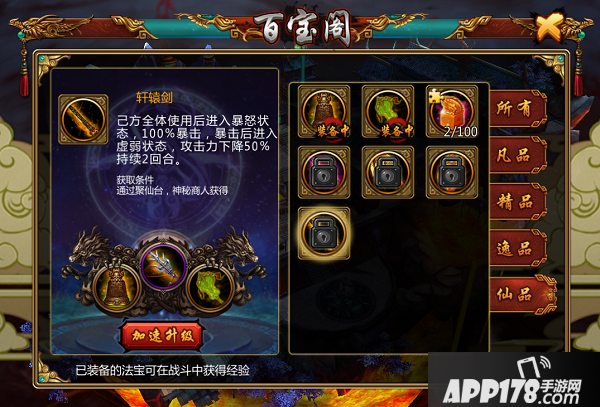 在游戏中,我们可以直接通过法宝界面查阅各种品质法宝的作用和获得的条件。这些条件大多数都不那么容易,想要得到可是要小费一番心思呢。总体来说越强大的法宝,获得越发的困难。