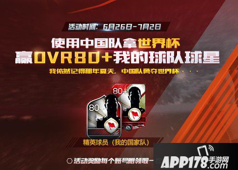 1、在活动期间,使用中国队在FIFA世界杯之旅中,获得任意阶段的世界杯冠军,就可以在次日获得一名世界杯我的球队精英球星。