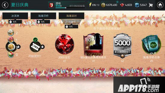 使用刚刚获得的冰淇淋与圣代,您将可以在海滩派对章节兑换奖励!点击开始派对的按钮,您将可以看到30个密封的奖励包裹,其中包含必定包含2000宝石,1个80+夏日庆典精英球员,2张5000经验的训练经验卡,以及5个海滩浮桥点券,可以用于开启在海滩浮桥章节的冒险!