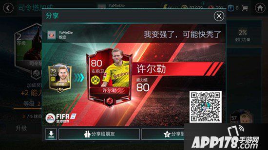 2、当打开礼包、点击进入球员信息、球员OVR提升、天赋升级时,新增加截图分享功能,截图中可以体现出球星的具体提升等级及前后变化,以及更加详细而有趣的文字说明。