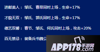 以上就是放开那三国邹氏属性图鉴的全部内容,希望能给喜欢邹氏的小伙伴们带来帮助。更多 相关攻略稍后送上~请继续关注APP178手游网~更多精彩期待你的分享~
