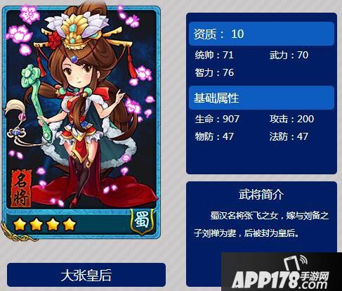 以上就是放开那三国大张皇后属性图鉴的全部内容,希望能给喜欢大张皇后的小伙伴们带来帮助。更多 相关攻略稍后送上~请继续关注APP178手游网~更多精彩期待你的分享~