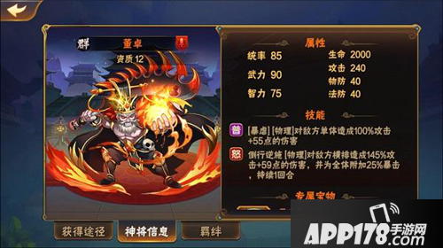 董卓,群雄主公,可大幅提升友军暴击率,受击时自动回血,若攻击中毒目标,还会降低其怒气!