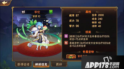 怒攻技能为悬壶济世,LV1时对友方全体治疗105%攻击+52点的生命。强力天赋为神医8,普攻时给目标附加20%被治疗率,持续两回合,可叠加。华佗的存在大大提升了阵容的生存能力。