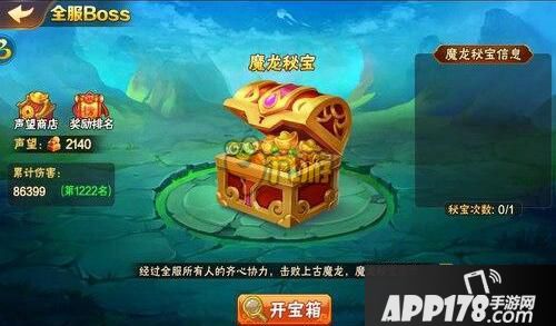 攻打全服BOSS可以获得声望,而当全服BOSS被打败之后,在8小时之内全服的玩家都可以在全服BOSS的界面打开一个宝箱,里面有意外的惊喜哦。如果是给予全服BOSS最后一击的玩家,还可以另外获得一个丰厚奖励的宝箱。但是也不是所有玩家都能去攻打全服BOSS,只有30级以上的玩家才有资格去攻打全服BOSS。