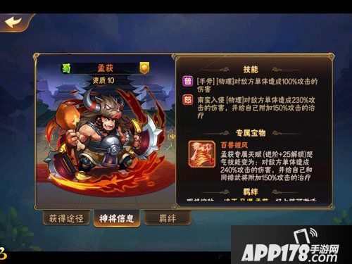 优点:孟获在肉盾型武将中属于攻守均衡的一类,怒攻在对敌方单体造成大量伤害的同时还能给自己附加治疗。而孟获的生命总羁绊为80%,如果激活了所有的生命羁绊,那么将既有高血量又能在战斗中回复血量,这将使得孟获非常抗打。当对孟获进行进阶开启特性之后,还能够减伤,并且普攻时也能回复生命,和提高回复量。说孟获是放开那三国2中的第一肉是当之无愧的!