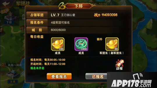 满足条件军团的团长和副团可以在世界地图里选两个计划拿下的城池,普通玩家也可以通过点击城市图标来了解城市防御、报名及开战时间、当前报名状况以及占领收益等城市信息。