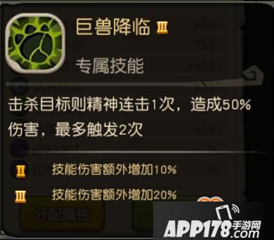 专属技能2 巨兽降临,击杀目标则精神连击一次,造成50%伤害,最多触发两次。4星伤害额外增加10%,5星伤害额外增加20%。这个技能是象鼻鸟的绝对核心技能了,在队伍中将象鼻鸟的速度调整为最低,这样可使它在最后一个发动进攻,经过一轮战斗的伤害,敌方有较大几率出现出现残血单位,此时象鼻鸟进行攻击就有非常大几率可以打出收割的效果,最多可以使用三次技能,如果被技能拥有法术连击的话,就有几率使用出4次技能,如果拥有追击技能的话,更是有可能一回合打出7次攻击,这敌方全体来说,无异于是毁灭性的打击。
