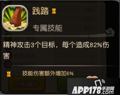 象鼻鸟技能选择首先专属技能1 践踏,精神攻击3个目标,每个造成82%的伤害。非常常规的法系AOE技能,伤害比同为法系宠物的SSR法宠鳄鲨少了5%,在达到3星后可以额外增加6%的伤害。
