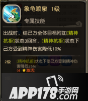 专属技能1 象龟喷泉:出战时,给己方全体目标附加[精神抗拒]状态3回合,[精神抗拒]状态下己方受到精神伤害降低10%