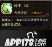 专属技能2 碎甲:物理攻击,有40%几率降低目标10%物理防御2回合