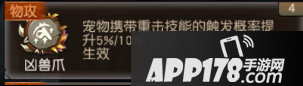 凶兽爪:宠物携带重击技能的触发概率提升5%/10%/15%/20%/25%;仅战宠生效。