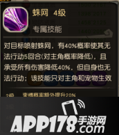 技能效果:对目标喷射蛛网,有40%概率使其无法行动5回合(对主角概率降低),且承受所有伤害降低40%,但自身也无法行动;该技能只对主角和宠物生效