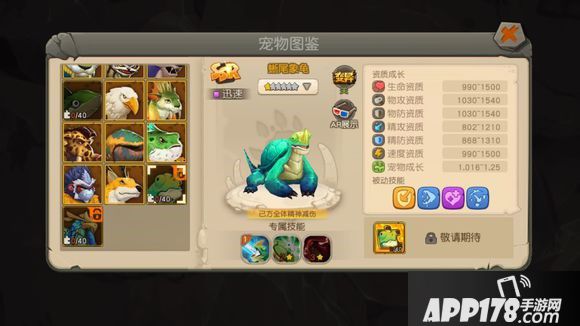 结论:有空闲资源养一只也不吃亏…建议别作为核心养…毕竟需要特定的阵容乌龟才能发挥作用技能方面参考青蛙,加点方面建议2耐2敏,剩下1点自己调配,技能方面由于没加体制的关系,血量稀少,顽强(重生)高敏,抵抗,强壮,标配,其他自行搭配,兽魂建议圣兽甲撑血,配合强壮有不俗的血量,2耐加点也不是很怕物理,2敏配合高敏出手问题不大,大家自行斟酌…我再研究研究