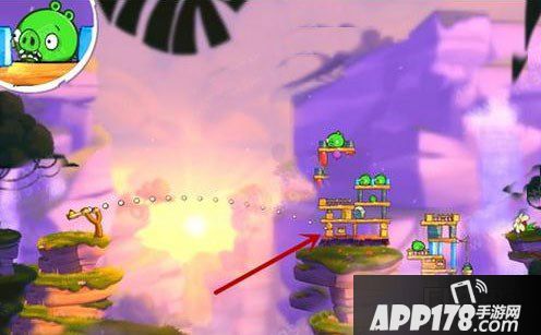 在第二个小关卡这里,使用加速黄鸟,着落点设置为小编为大家标记的那个位置,将上的建筑弄塌的同时,会引爆下方的炸弹,从而残片碎瓦会飞向另外一个建筑造成一定的伤害,运气好一次性搞定,运气不好的话补枪就行。