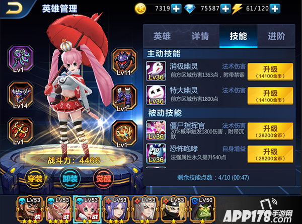 技能通过消耗金币和技能点升级,技能点可以通过购买或者时间恢复获得。技能的等级不能超过英雄的等级,紫色技能的最高等级为30级。