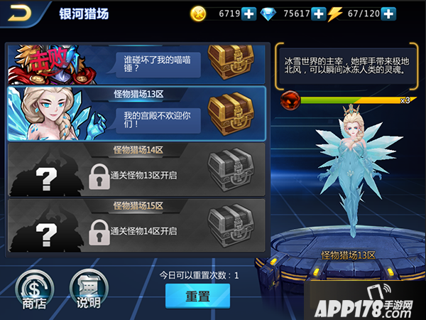 目前,银河猎场一共设了15层,每层都关押着一位强大的BOSS。玩家从第一层开始逐层挑战,胜利即可获得英雄魂石、猎场币、装备和随机道具。
