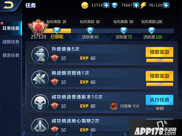 日常任务开启后,玩家的主要升级途径就在这里。重要的事情说三遍,日常任务奖励大量经验!日常任务奖励大量经验!日常任务奖励大量经验!游戏中后期,升级要求的经验变多了,完成日常任务可以得到最大的收益。千万不要忽视日常任务哦,日常任务加上扫荡副本,是快速升级的最好办法!