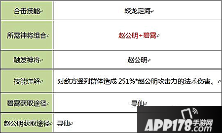 使用技巧:赵公明+碧霄的合击技组合是攻击敌方竖列的神将组合。配合赵公明的超高攻击属性,释放该技能往往可以做到秒杀一个敌方后排,打残一个敌方前排。