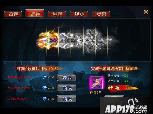 神兵作为装备中主输出的神级装备,持续培养最终可以炼成非常强大的兵器。那么如何修炼呢?神兵分为六阶。每一个阶段达成,都有其目标,达成一个目标可得不同钻石奖励!完成当前的目标阶段,神兵的属性和神通值都会增加!
