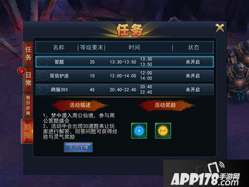 活动:游戏里在一定时间段会开放一些活动,你可以在这里查看最近时间开放的活动,并参与哦!