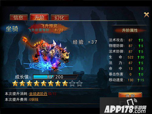 升阶:升阶是坐骑达到一定的飞升等级后就可以飞升得到更强大的坐骑,它的各项属性都会大幅提升的。当然如果你要升阶,也是需要坐骑进阶丹,这个丹药只有去日常副本的,坐骑副本里才能得到哦!这个我们另开一篇再讲。