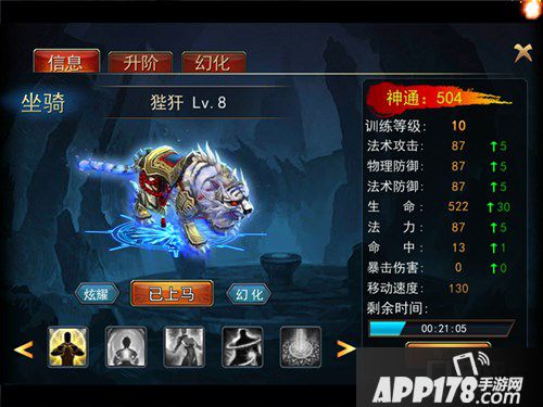 坐骑系统分为三个部分:坐骑信息,升阶,幻化。