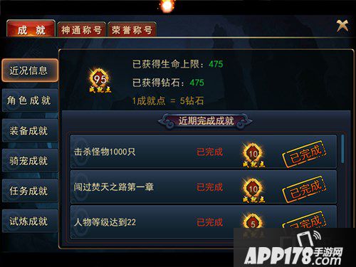 成就:主要有,角色成就,装备成就,骑宠成就,任务成就,试练成就。在第一栏,近况信息里可以查看获得的生命上限,获得的钻石等信息。获得一点成就点,可以活动5钻石。
