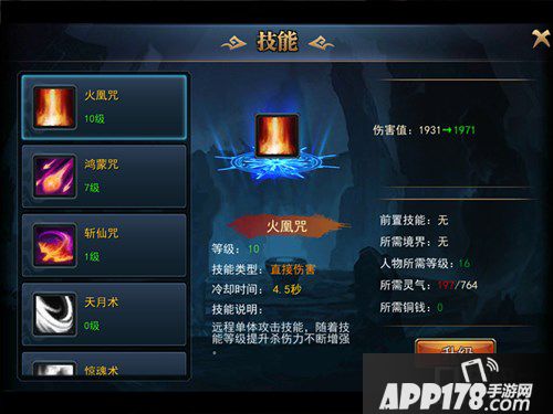 技能系统在左上角人物头像里,点开就可以看见,再点击技能按钮,就进入技能界面,如果你已经人物达到拥有技能的等级,就可以使用技能升级了,每次升级都需要消耗灵气,当灵气不足时需要通过升级,任务或者炼制获得。