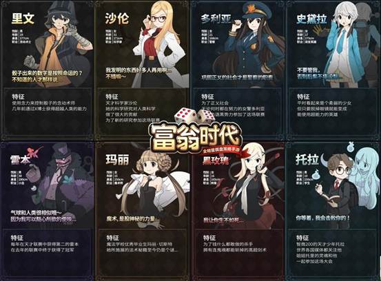 《富翁时代》的整体画面风格采用了唯美的二次元日漫风,剧情围绕着邪恶艾克斯博士举办“天才联赛”邀请世界各地能力者展开。目前已经开放了15 名拥有自己背景和独特个性的可控角色。他们除了在游戏里有不同的属性侧重点和能力侧重点外,拥有自己的背景故事,性格爱好,甚至独立的语言和动作。丰富的 剧情和角色让《富翁时代》完全可以成为一部独立的漫画进行阅读。同时,《富翁时代》手游与国内著名动漫发行“高能漫画”联手打造的同名漫画即将登录各大漫 画平台,大家可以从漫画的角度感受整个故事的热血与战斗!