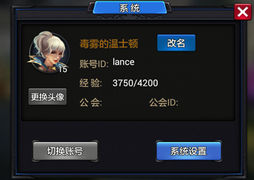 在游戏主界面点左上角英雄头像,可以打开一个窗口,在这里可以便捷的更改角色名,以及后续开放查看公会相关信息、帐号切换和更换头像。