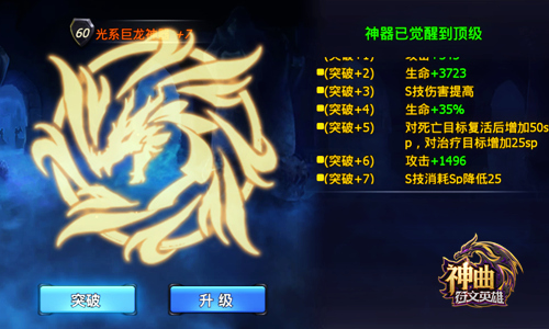 魔狱巨龙的神器烙印,是由淡金色魔纹所组成的一个龙形图腾,威武的龙头居中,霸气天成。作为《神曲之符文英雄》中的橙色魔灵,魔狱巨龙神器突破可以达到+7,在突破时技能和属性会获得大幅增强。比如+5时S技能附加合击效果、+7时获得光环“物理伤害提高15%”等等。