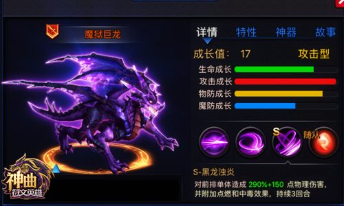 《神曲之符文英雄》的魔狱巨龙,可以使用毁灭之牙,用强悍的龙爪来造成物理伤害;也可以利用天赋,引动暗能量,对全体敌人造成大量伤害,并且引爆点燃效果;而超强的必杀S技“黑龙浊炎”,更是可以对前排单体造成巨额伤害,并且附加点燃和中毒效果,持续3回合!