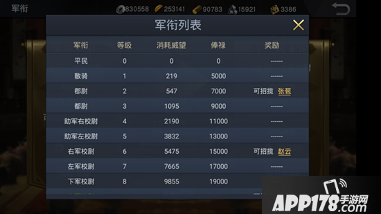 玩家们在通关董卓势力,进入国家之后,即可从主城议事厅中进入军衔界面。提高军衔需要同时达到两个条件:当前威望值及征战通关进度,缺一不可。值得注意的是,当玩家提高军衔时,是会消耗大量威望值的,所以,想要高人一等的有志之士们,就需要想办法积累威望值了。