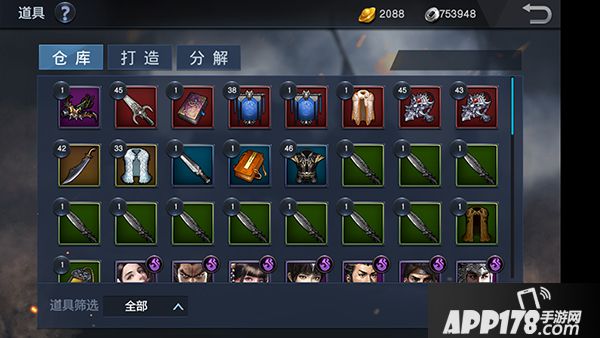 主公可以对仓库中的装备进行分解、展示、降级(适用于已强化的装备)。