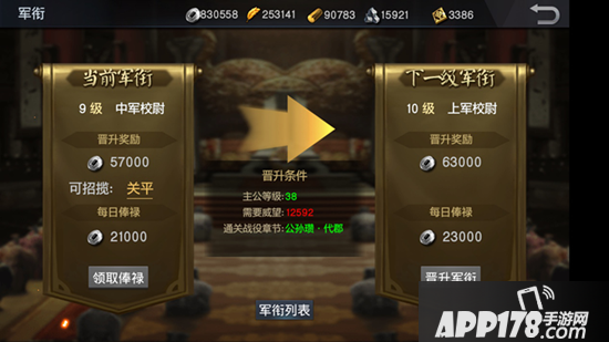 玩家们在通关董卓势力,进入国家之后,即可从主城议事厅中进入军衔界面。提高军衔需要同时达到两个条件:当前威望值及征战通关进度,缺一不可。值得注意的是,当玩家提高军衔时,是会消耗大量威望值的,所以,想要高人一等的有志之士们,就需要想办法积累威望值了。