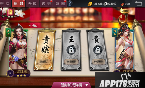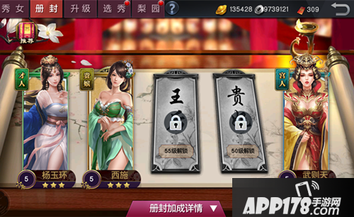 将军们轻轻松松到了30级,养眼的后宫系统终于开启了,虽然这时只有册封才人、宫人两个位置!但是这绝对是你实现战力飞跃的关键点啊!不要犹豫,花木兰和梁红玉是你们最佳的选择!