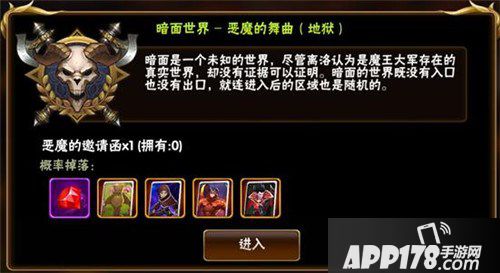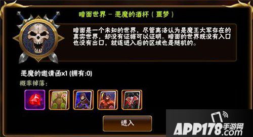 进入暗面普通需要等级达到:15级方可进入,暗面世界--恶魔的邀请函。每次进入时都需要消耗一张恶魔的邀请函才能进入。(恶魔的邀请函可以通过击杀首领boss概率掉落获得)