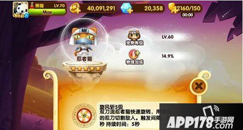 忍者猫原本是一只来自东洋的小野猫,后来经过大小姐的调教变成了一只双刀流的忍者猫。在它五星级的时候会给玩家提供14.9%的物理加成。