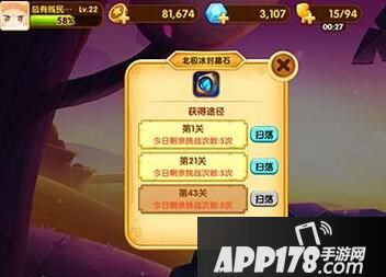 而玩家想要进阶北极冰封的玩家可以在第1关卡、第21关卡、第43关卡、第59关卡、第103关卡通过扫荡或者过关获得,这些关卡每天可以挑战的次数都是5次。