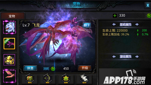 通过上图宠物入口进入宠物界面,选择宠物入库后可在下方界面进行出战及升级操作,宠物品质越高增加属性维度越多。宠物升级需要消耗血饵,血饵可以通过分解多余宠物获得。