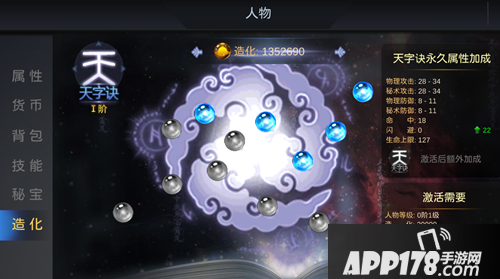 字诀目前开放十二种:天、地、人、鬼、神、佛、魔、畜、慑、镇、遁、物。越靠后的字诀激活等级要求越高,激活字诀内星星可获得永久属性加成, 激活可能失败,字诀星星全部激活后可获得额外属性加成效果。
