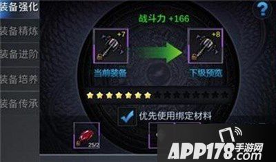 装备还可进行强化、精炼和培养来提升其基础属性、精炼属性和培养属性。装备强化可能会失败,强化需要消耗绑定钞票和明镜石,强化+7后还需要龙砂石和镇煞石(确保强化失败不掉级)。装备强化到一定等级还可以给装备带来流光效果。