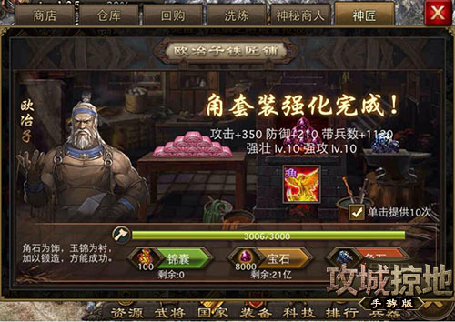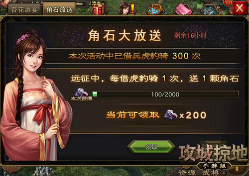 继“极套装”后,《攻城掠地》手游新版推出了“角套装”(角套装的“角”字来自于著名玩家“角色名”),快来挑战新的进化吧!玩家必须满足等级满、宝石满、丝绸满三个条件才能开始升级套装。升级套装中最重要的道具就是“角石”,这个道具如何获得呢?玩家满级后的经验转换形式从现在的“锦囊”变成“玉石”,经验进度条每满一次获得一颗角石。另外,你还可以参加“角石大放送”活动,通过借兵虎豹骑获得角石。