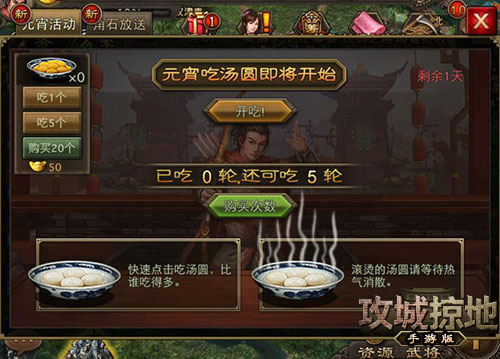 正月十五闹花灯,吃汤圆,《攻城掠地》手游里自然也是节日气氛浓浓,搞起了吃汤圆比赛(奖励游戏资源)。从活动开始至活动最终结算前,玩家将挑战10轮汤圆宴席。每位玩家有5轮免费吃的机会,可以花费金币额外购买吃汤圆比赛的轮数。玩家会根据每轮吃掉的汤圆碗数,获得相应的称号领取金汤圆。另外,活动结束时,官方还会根据吃汤圆碗数进行全国排名,发给玩家们相应的“排名奖励”。全国第一的吃货冠军就是你了!